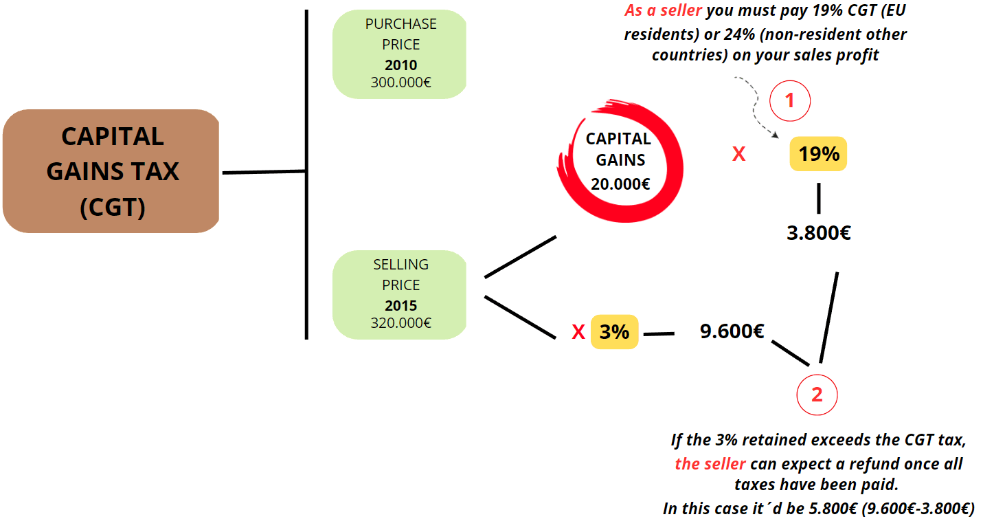 El vendedor no residente está obligado por ley a pagar un 3% sobre el precio de compra venta (retención a cuenta), que normalmente será retenido por el comprador, quien se encargará del pago a las autoridades fiscales.